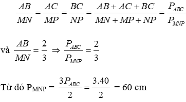Bài 13: Hãy chọn câu đúng. Tam giác ABC đồng dạng với tam giác MNP theo tỉ số , biết chu vi của tam giác ABC bằng 40 cm. Chu vi của tam giác MNP là: