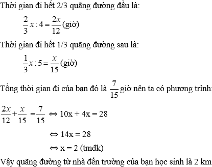 Bài 6: Một bạn học sinh đi học từ nhà đến trường với vận tốc trung bình 4 km/h. Sau khi đi được 2/3 quãng đường bạn ấy đã tăng vận tốc lên 5 km/h. Tính quãng đường từ nhà đến trường của bạn học sinh đó, biết rằng thời gian bạn ấy đi từ nhà đến trường là 28 phút.