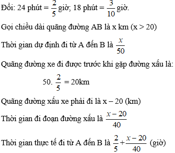 Bài 10: Một xe tải đi từ A đến B với vận tốc 50 km/h. Đi được 24 phút thì gặp đường xấu nên vận tốc trên quãng đường còn lại giảm còn 40 km/h. Vì vậy đã đến nơi chậm mất 18 phút. Tìm chiều dài quãng đường từ A đến B.