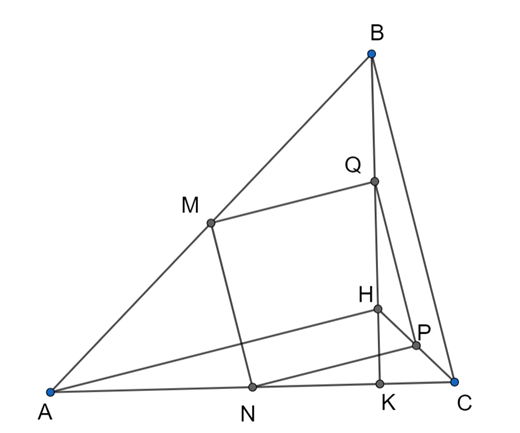 Bài 4. Cho tam giác ABC, có góc . Trong tam giác, các đường cao cắt nhau tại H. Lần lượt lấy các trung điểm của AB, AC, HC và HB là M, N, P, Q. Chứng minh rằng MP ⊥ NQ.
