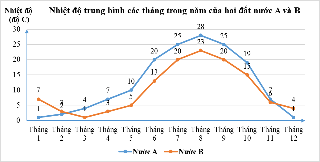 Bài 7. Nhiệt độ trung bình các tháng trong năm của hai đất nước được biểu diễn bằng biểu đồ sau đây: