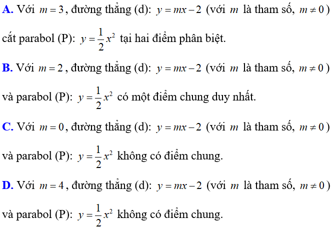 Bài 8: Với m ≠ 0, khẳng định nào sau đây là đúng đối với đường thẳng (d): y = mx - 2 và parabol (P): mx2?