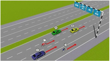 Giải thích đáp án: Nhìn vào bảng chỉ dẫn loại phương tiện theo làn đường: Xe con (E) đi trên làn dành riêng cho mô tô nên vi phạm; Xe mô tô (D) chạy trên làn dành riêng xe ô tô nên cũng vi phạm.