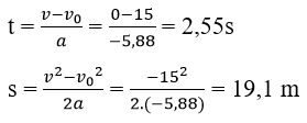 Bài 3: Một ô tô đang chuyển động với vận tốc 15 m/s thì tắt máy, hãm phanh. Tính thời gian và quãng đường ô tô đi thêm được cho đến khi dừng lại. Biết hệ số ma sát giữa bánh xe và mặt đường là 0,6. Lấy g = 9,8 m/s2