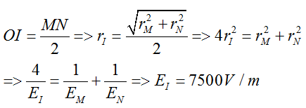 Bài 5: Tại điểm O trong không khí có một điện tích điểm. Hai điểm MN trong môi trường sao cho OM vuông góc ON. Cường độ điện trường tại M và N lần lượt là 5000 V/m và 3000 V/m. Cường độ điện trường tại trung điểm MN là?