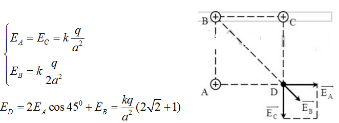 Bài 17: Tại 3 đỉnh của một hình vuông cạnh a, đặt 3 điện tích dương có cùng độ lớn q. Tìm độ lớn cường độ điện trường tại đỉnh còn lại của hình vuông.