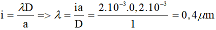 Bài 26: Trong thí nghiệm I-âng về giao thoa ánh sáng, khoảng cách giữa hai khe sáng là 0,2 mm, khoảng cách từ hai khe sáng đến màn ảnh là D = 1 m, khoảng vân đo được là i = 2 mm. Bước sóng của ánh sáng là: