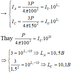 Bài 40: Trong môi trường đẳng hướng và không hấp thụ âm, có 3 điểm thẳng hàng theo đúng thứ tự A; B; C với AB = 100 m, AC = 250 m. Khi đặt tại A một nguồn điểm phát âm công suất P thì mức cường độ âm tại B là 100 dB. Bỏ nguồn âm tại A, đặt tại B một nguồn điểm phát âm công suất 3P thì mức cường độ âm tại A và C là