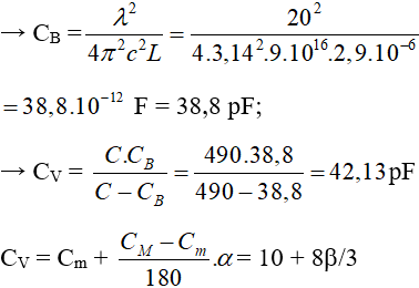 Bài 18: Một tụ điện xoay có điện dung tỉ lệ thuận với góc quay các bản tụ. Tụ có giá trị điện dung C biến đổi giá trị C1 = 10pF đến C2 = 490pF ứng với góc quay của các bản tụ là α các bản tăng dần từ 0o đến 180o. Tụ điện được mắc với một cuộn dây có hệ số tự cảm L = 2μH để làm thành mạch dao động ở lối vào của 1 một máy thu vô tuyến điện. Để bắt được sóng 19,2m phải quay các bản tụ một góc α là bao nhiêu tính từ vị trí điện dung C bé nhất.