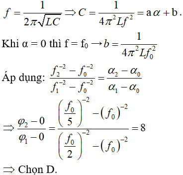 Bài 22: Một mạch dao động gồm một cuộn cảm thuần có độ tự cảm xác định và một tụ điện là tụ xoay, có điện dung thay đổi được theo quy luật hàm số bậc nhất của góc xoay α của bản linh động. Khi α = 0o, tần số dao động riêng của mạch là f0. Khi α = φ1, tần số dao động riêng của mạch là f0/2. Khi α = φ2, tần số dao động riêng của mạch là f0/5. Chọn phương án đúng.