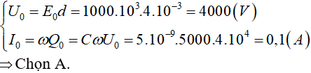 Bài 24: Trong mạch dao động LC lý tưởng, tụ điện phẳng có điện dung 5 nF, khoảng cách giữa hai bản tụ điện là 4 mm. Điện trường giữa hai bản tụ điện biến thiên theo thời gian với phương trình: E = 1000cos5000t (kV/m) (với t đo bằng giây). Cường độ dòng điện cực đại là: