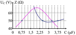 Bài 5: [THPT QG năm 2017 – Câu 38 – MH3] Cho đoạn mạch có R, L, C mắc nối tiếp, trong đó giá trị điện dung C thay đổi được. Điện áp xoay chiều đặt vào hai đầu đoạn mạch có giá trị hiệu dụng U và tần số f không đổi. Hình vẽ bên là đồ thị biểu diễn sự phụ thuộc của điện áp hiệu dụng UC giữa hai bản tụ điện và tổng trở Z của đoạn mạch theo giá trị của điện dung C. Giá trị của U gần nhất với giá trị nào sau đây?