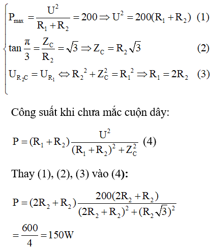 Câu 19. Đoạn mạch xoay chiều AB có điện trở R1 mắc nối tiếp với đoạn mạch R2C, điện áp hiệu dụng hai đầu R1 và hai đầu đoạn mạch R2C có cùng giá trị, nhưng lệch pha nhau π/3. Nếu mắc nối tiếp thêm cuộn dây thuần cảm thì cosφ = 1 và công suất tiêu thụ là 200W. Nếu không có cuộn dây thì công suất tiêu thụ của mạch là bao nhiêu?