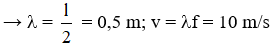 Câu 6: Một nam điện có dòng điện xoay chiều tần số 50 Hz đi qua. Đặt nam châm điện phía trên một dây thép AB căng ngang với hai đầu cố định, chiều dài sợi dây 60 cm. Ta thấy trên dây có sóng dừng với 2 bó sóng. Tính vận tốc sóng truyền trên dây?