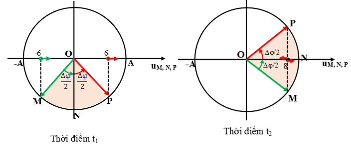 Sử dụng vòng tròn lượng giác biểu diễn li độ dao động tại M, N và P ở hai thời điểm t1 và t2 (lưu ý sóng truyền từ P đến M nên vectơ OP quay trước vectơ OM).