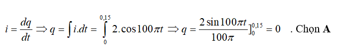 Ví dụ 2: Dòng điện xoay chiều có biểu thức i = 2cos100πt(A) chạy qua dây dẫn . điện lượng chạy qua một tiết điện dây trong khoảng thời gian từ 0 đến 0,15s là :