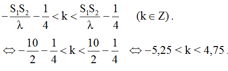 Vì k ∈ Z nên k = -4; -3; ...;-1; 0; 1; ...; 5. Vậy có 10 điểm cực đại giao thoa trên S1S2.
