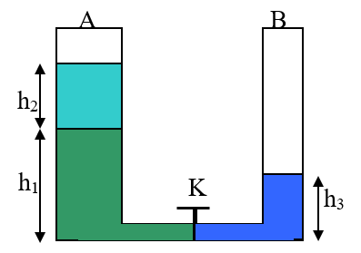 Mở khoá K để hai bình thông nhau. Hãy tính độ chênh lệch chiều cao của mặt thoáng chất lỏng ở 2 bình.