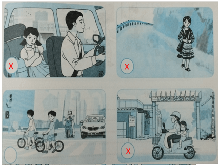 Vở bài tập Đạo đức lớp 3 trang 65 Bài tập 4: Em hãy đánh dấu X vào ô trống ở dưới tranh thể hiện hành động không tuân thủ quy tắc an toàn giao thông.