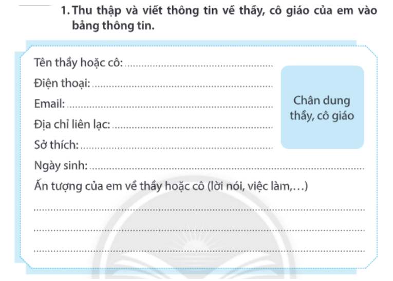 Vở bài tập HĐTN lớp 3 trang 19 Nhiệm vụ 2: Làm bảng thông tin về thầy, cô giáo của em.