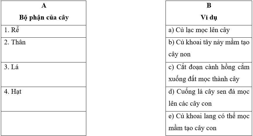 Câu 3 trang 41 VBT Khoa học lớp 5: Nối tên bộ phận của cây ở cột A với ví dụ ở cột B cho phù hợp.