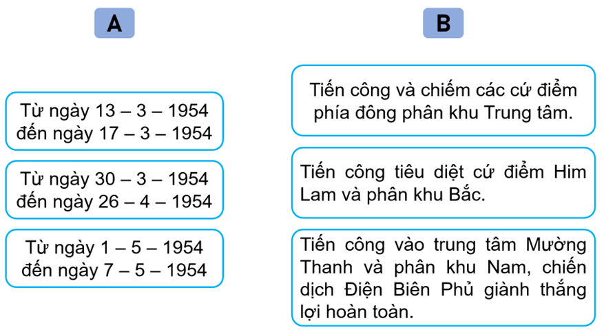 Bài tập 2 trang 59 Vở bài tập Lịch Sử và Địa Lí lớp 5: Nối thông tin ở cột A với thông tin ở cột B cho phù hợp về diễn biến chính của chiến dịch Điện Biên Phủ.