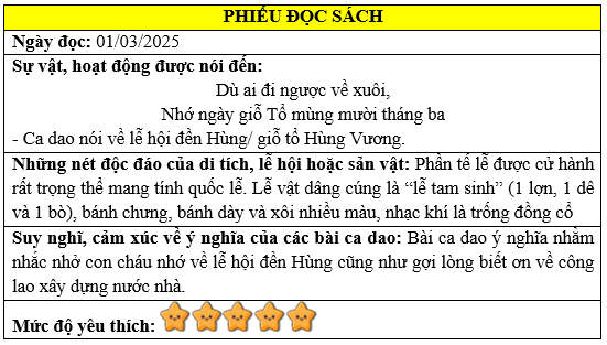 Vở bài tập Tiếng Việt lớp 5 Tập 2 trang 50 Bài 1: Đọc 2 – 3 bài ca dao về di tích, lễ hội hoặc sản vật độc đáo ở một địa phương và viết thông tin vào phiếu đọc sách.