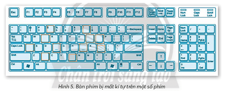 Vở bài tập Tin học lớp 3 trang 14 Bài tập 3: Bàn phím máy tính ở Hình 5 bị mất kí tự trên một số phím. Em hãy ghi kí tự đã mất vào các phím.