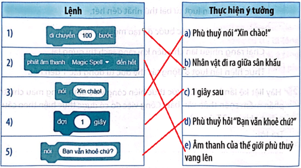 Câu 4 trang 50 Vở bài tập Tin học lớp 5: Em hãy ghép mỗi lệnh sau với ý nghĩa của chúng sao cho phù hợp để thực hiện ý tưởng: Trong một buổi biểu diễn tại nhà hát, nhân vật phù thuỷ xuất hiện trên sân khấu. Nhân vật đi ra giữa sân khấu. Âm thanh của g thế giới phù thuỷ vang lên. Sau đó phù thuỷ nói “Xin chào!”. Một giây sau, phù thuỷ hỏi “Bạn vẫn khoẻ chứ?”.
