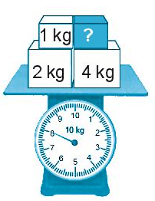 Các vật đã biết cân nặng là 1 kg, 2 kg và 4 kg, có tổng cân nặng là 1 kg + 2 kg + 4 kg = 7 kg.