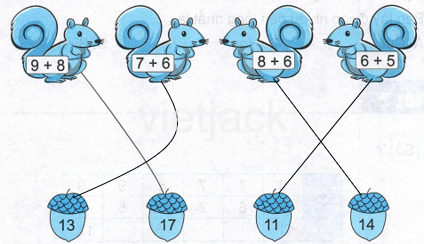 a) Em thực hiện các phép tính trong các con sóc. Nối con sóc vào những hạt dẻ ghi phép tính có cùng kết quả.