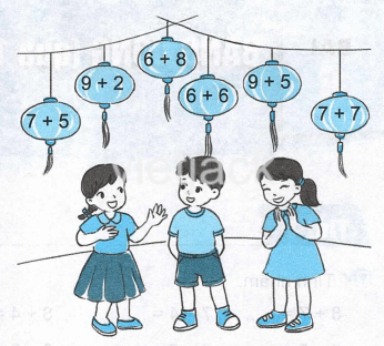 + Bạn Hoa lấy các đèn lồng ghi phép tính có kết quả bằng 14, tức là lấy các đèn ghi phép tính 7 + 7 = 14; 6 + 8 = 14; 9 + 5 = 14