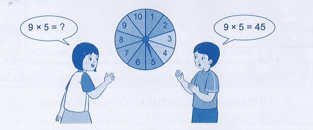 Vở bài tập Toán lớp 3 trang 27 Bài 4: Quay kim trên vòng tròn để chọn một số. Thực hiện phép nhân 9 với số đó rồi nêu kết quả.