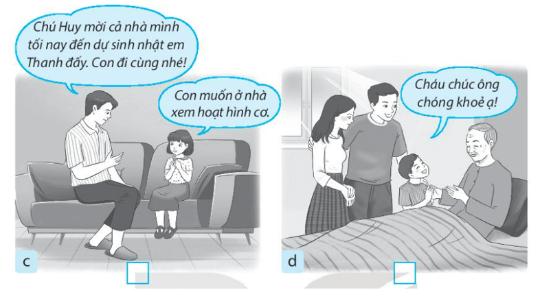 Vở bài tập Tự nhiên xã hội lớp 3 trang 6 Bài 2: Đánh dấu X vào ô trống dưới những hình thể hiện việc em nên làm đối với các thành viên trong gia đình họ hàng.