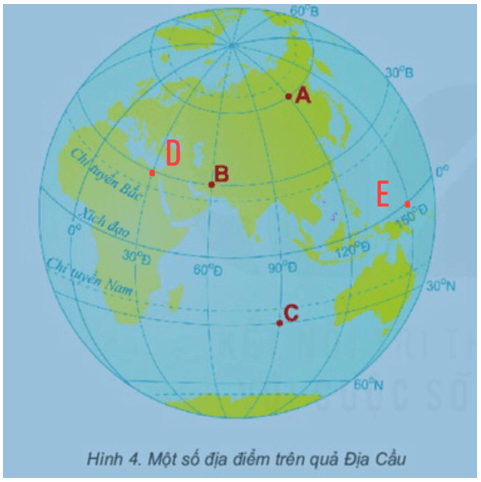 Câu 3 trang 8 vở thực hành Địa lí lớp 6: Xác định vị trí của các điểm sau trên hình D (300B, 300Đ), E (00,1500Đ).