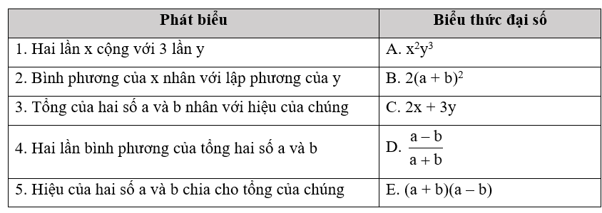Hãy nối mỗi diễn đạt bằng lời (được đánh số 1, 2, 3, ...) với một biểu thức đại số